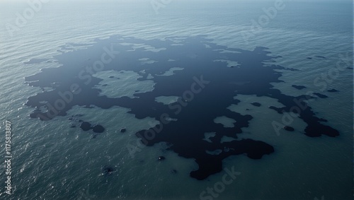 © GMeta, Fototapeta premium Aerial view of oil slick spreading in ocean creating reflective shapes
