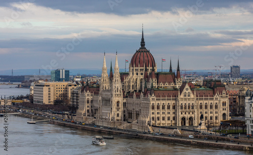 © derege, Fototapeta premium Aerial view of old city Budapest with Parliament building