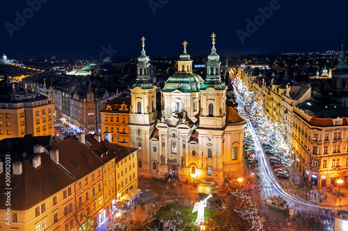 Fototapeta premium Aerial view of Old Town square with illuminated St. Nicholas' Church, a...