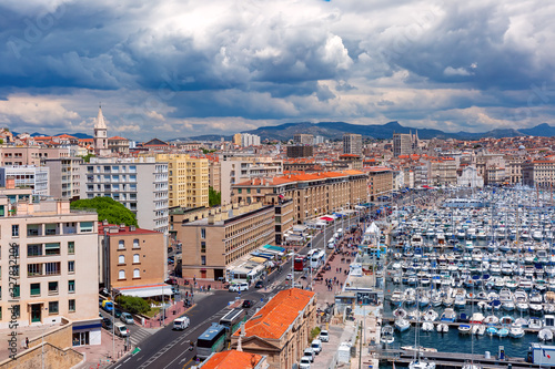 © Kavalenkava, Fototapeta premium Aerial view of Old Vieux Port on sunny day in the historical city center of Marseilles, France