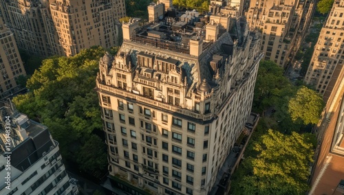Naklejka premium Aerial view of ornate New York City apartment building, lush greenery...