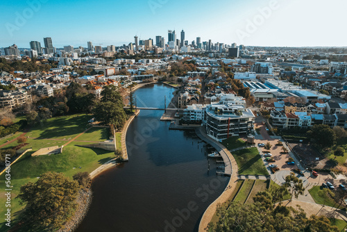 © LisaGageler, Fototapeta premium Aerial view of Perth cityscape looking over Claisebrook Cove in East Perth