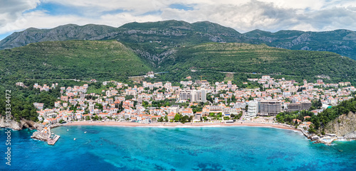 Naklejka premium Aerial view of Petrovac, Montenegro, showcasing its stunning coastline, blue...