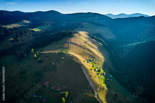 © anatoliy_gleb, Obraz premium Aerial view of picturesque valley with rolling hills, lush forests, and scattered houses. Sunlight bathes landscape in warm glow, highlighting vibrant greens and creating serene atmosphere.