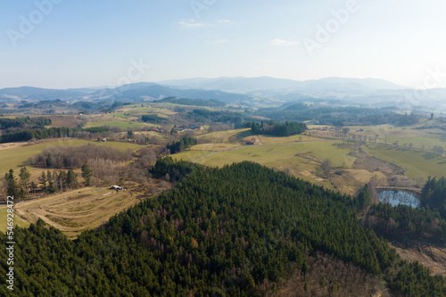 © bilanol, Fototapeta premium Aerial view of pine forest with large area of cut down trees as result of global deforestation industry. Harmful human influence on world ecology