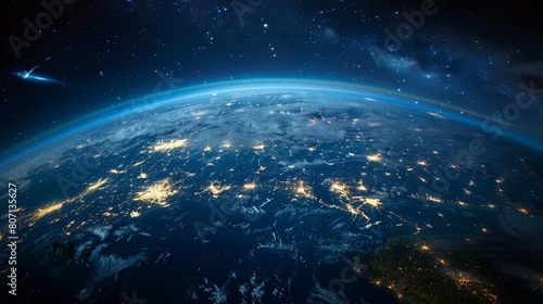 Fototapeta premium Aerial view of Planet Earth at night, showcasing the glowing lights of cities...