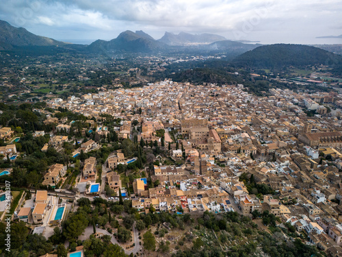© Wirestock, Naklejka premium Aerial view of Pollenca in Mallorca, drone photo in cloudy day
