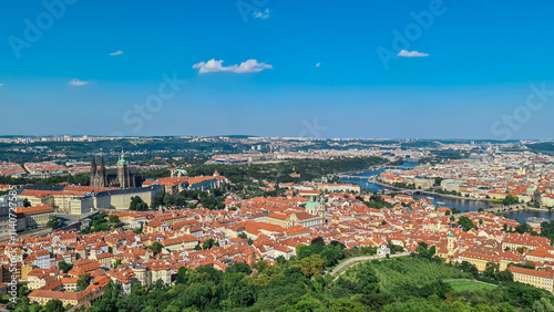 Obraz premium Aerial view of Prague seen from Petrin tower, Czechia. City's iconic landmarks, including Prague Castle, St. Vitus Cathedral and Charles Bridge are visible in distance. Vltava River winds through city