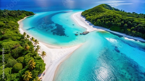 © Manatsavee, Obraz premium Aerial View of Pristine White Sand Beach and Turquoise Lagoon - Banner Image