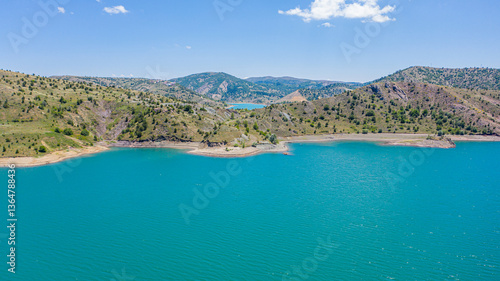 © Alperen, Naklejka premium Aerial view of Pusat Dam lake in green valley Halfeti Sivas Turkey
