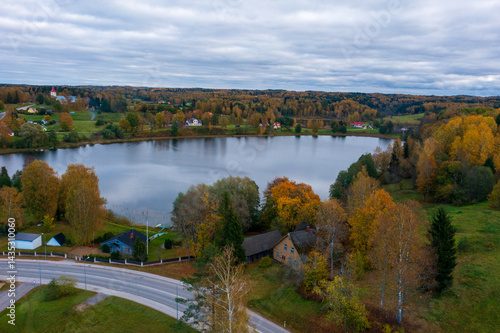 © Aimur, Fototapeta premium Aerial view of Rõuge lake surrounded by vibrant autumn foliage in the Estonian countryside. Rural village with scattered houses along the shoreline under cloudy skies revealing the beauty of Estonia