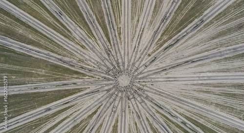 © Paino, Obraz premium Aerial View of Railway Tracks Converging in a Circular Pattern, Providing a Unique Perspective