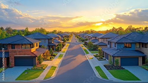 © KeJayStudio, Obraz premium Aerial view of residential houses in Melbourne's suburb. Elevated view of Australian homes against blue sky. Copy space for text. Point Cook, VIC Australia.
