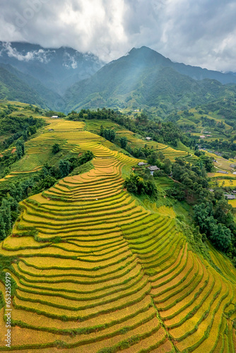 © Dong, Fototapeta premium Aerial view of rice field or rice terraces , Sapa, Vietnam. Y Linh Ho village, Ta Van valley