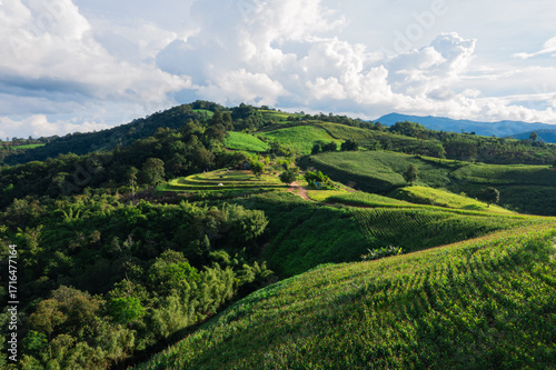 © Panwasin, Fototapeta premium Aerial view of rice terraces and village in Loei province, Thailand.