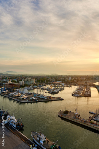 Fototapeta premium Aerial view of Rimini sea port with ships and blue water.