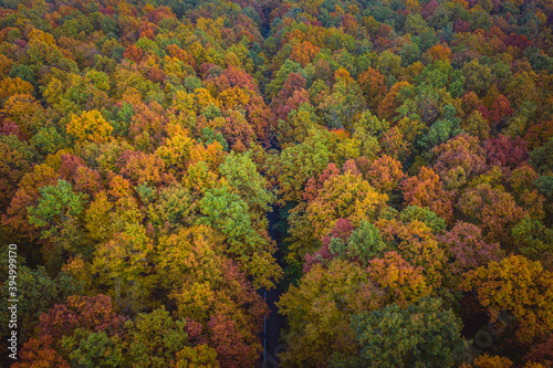 © lukszczepanski, Obraz premium Aerial view of road through colorful autumn forest