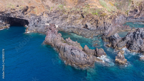 Obraz premium Aerial view of rocky cliffs on the coast of Madeira at the Atlantic ocean with clear blue water