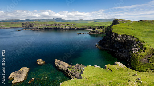 Obraz premium Aerial View of Rocky Coastal Landscape with Green Vegetation and Blue Ocean Water Under Bright Sunlight