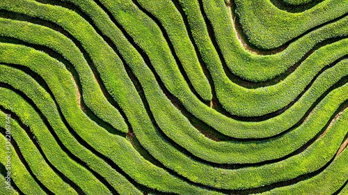 Fototapeta premium Aerial view of rolling green fields with curvilinear rows and pattern detail