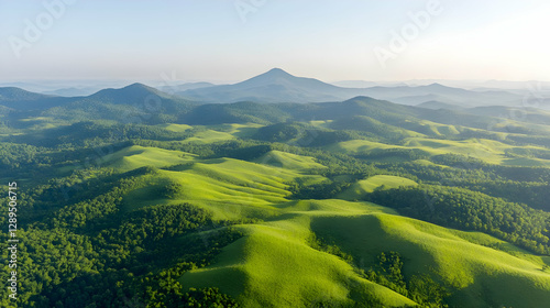 © KIMEHIME, Naklejka premium Aerial view of rolling green hills and distant mountains at sunrise