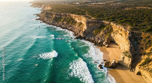 © Yuka, Obraz premium Aerial view of rugged coastline with waves crashing on sandy beach at sunset
