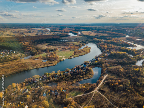 Fototapeta premium Aerial view of rural landscape in autumn. Small village houses, river, autumn...