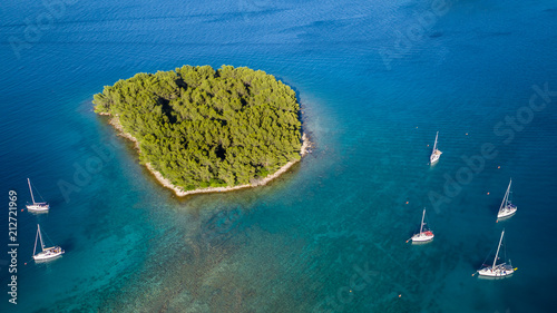 © Jag_cz, Naklejka premium Aerial view of sailing boats anchoring next to small island