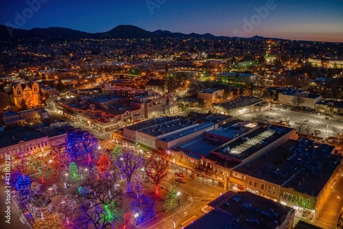 © Jacob, Fototapeta premium Aerial View of Santa Fe, New Mexico at Dusk during Christmas