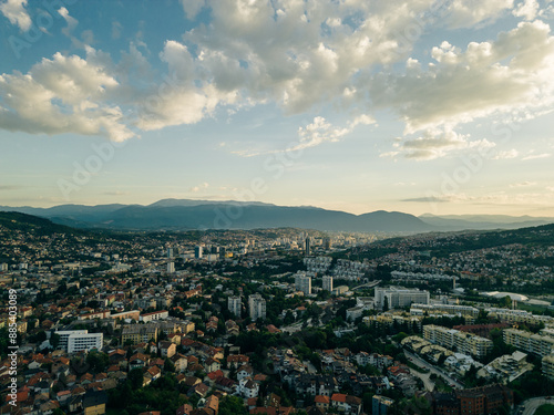 © IBRESTER, Obraz premium Aerial view of Sarajevo city at sunset in Bosnia and Herzegovina