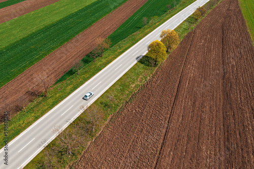 © Bits and Splits, Obraz premium Aerial view of scenic countryside landscape in spring with country road and passenger car on it driving along on sunny spring day, drone pov.