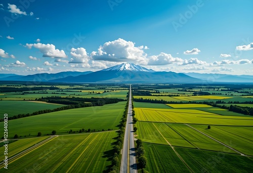 © Thebro , Fototapeta premium Aerial View of Scenic Road Leading to Snow-Capped Mountain