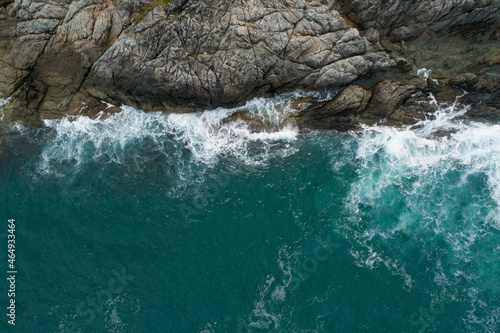 © Panya, Obraz premium Aerial view of sea crashing waves White foaming waves on seashore rocks Top view Rocky coast
