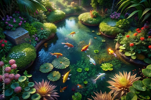 © Danicha, Obraz premium Aerial View of Serene Backyard Koi Pond with Water Lilies