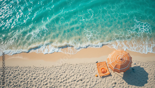 Naklejka premium Aerial View of Serene Beach Scene with Orange Umbrella and Lounger