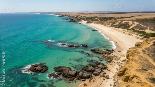 © shahin, Obraz premium Aerial view of serene turquoise ocean waters meeting sandy coastline and cliffs