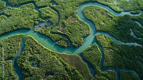 Fototapeta premium Aerial View of Serpentine Rivers and Lush Mangroves: An aerial perspective of a serene mangrove ecosystem, where winding rivers weave their way through a dense tapestry of green foliage.