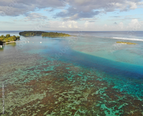 Obraz premium Aerial view of shades of blue and coral reefs over the Moorea lagoon in...