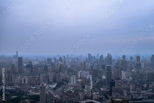 Fototapeta premium Aerial view of Shanghai city skyline under cloudy evening sky, showing dense...
