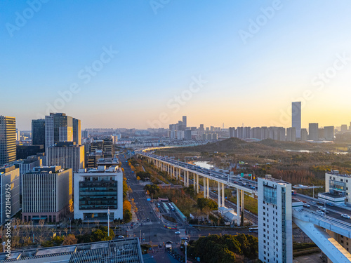 © Shengyi Lu, Obraz premium Aerial View of Shanghai skyline at sunset