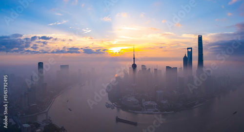 © Shengyi Lu, Fototapeta premium Aerial view of Shanghai skyline in downtown at sunrise.