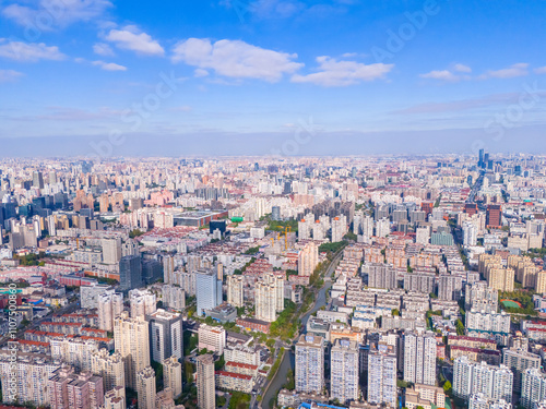 © Shengyi Lu, Obraz premium Aerial view of Shanghai skyline with blue sky background