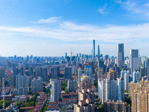 © Shengyi Lu, Fototapeta premium Aerial view of Shanghai skyscraper in downtown with blue sky background.