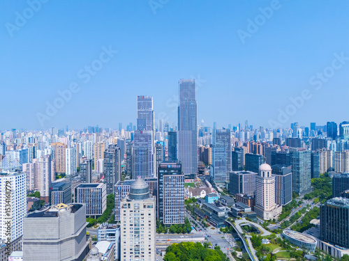 © Shengyi Lu, Fototapeta premium Aerial view of Shanghai skyscraper in downtown with blue sky background.
