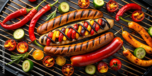Fototapeta premium Aerial view of sizzling hot dog and grilled vegetables on barbecue grill , barbecue, hot dog, vegetables, grilling