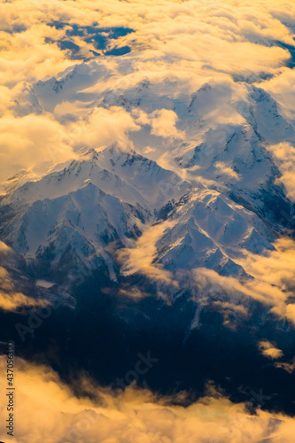 © CK, Obraz premium Aerial view of snowy mountains over Washington State , Aerial view from window of airplane in Seattle, Washington State ,USA