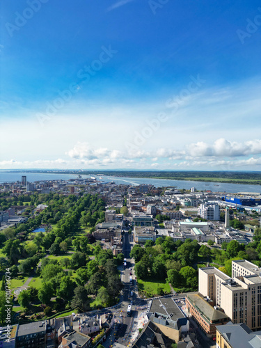 © Nasim, Fototapeta premium Aerial View of Southampton Port City of South England Coast, United Kingdom. May 17th, 2024. Drone's Camera Footage from Altitude.