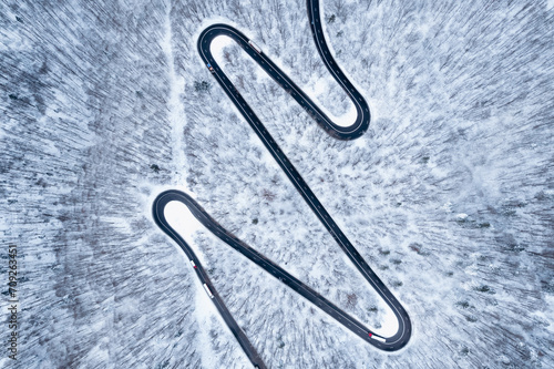 © Miha Creative, Fototapeta premium Aerial view of spectacular mountain road.Serpentines Romania.