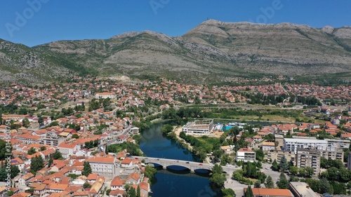 © dimabucci, Naklejka premium Aerial view of stone bridge (Kameni Most) on Trebisnjica river in Trebinje Old Town. Bosnia and Herzegovina. Summer sunny day, Turquoise water, mountains, trees, blue sky, small houses.