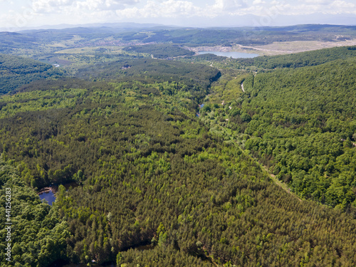 © Stoyan Haytov, Fototapeta premium Aerial view of Sua Gabra Lakes at Lozenska Mountain, Bulgaria